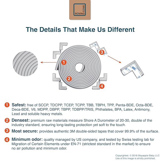 - CLEAN SAFETY: Roving Cove uses safe and pure raw material and was the first brand to make foam safety bumpers without the use of toxic flame-retardant chemicals (SCCPs). Our edge corner guards contain no BPA, no phthalates, no heavy metals, no latex, no SCCPs. Inherently flame-resistant; passed flammability tests under US regulations.