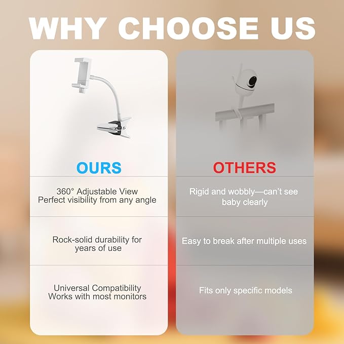 - 【Mounts Wherever You Need It】 The baby monitor clip holder can be mounted on crib, bed, shelf, furniture frames, windows, pole etc. Anywhere that can be clamped any surface up to 2" thick. Use it in the nursery, living room, or even outdoors— your baby monitor has no location limits! (Baby monitor NOT included)
