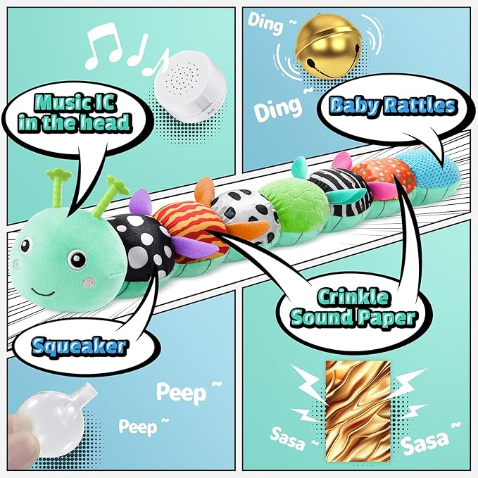 - 【6-in-1 Baby Toys】LIGHTDESIRE baby toys 6-12 months integrate 8 sensory toy functions -plush toys,baby musical toys,baby rattle toys,crinkle toys,teething toys,and car seat toys.It immerses babies in an independent play world.Press the caterpillar's head for a 25-second calming music melody, essential for tummy time and sensory exploration.
